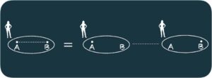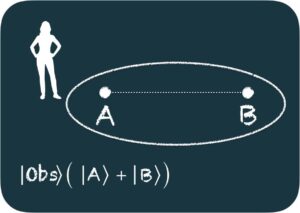 Usando una igualdad matemática simple, este estado lo podemos expresar así: |Obs⟩ (|A⟩+|B⟩)=|Obs⟩|A⟩ + |Obs⟩|B⟩. Cuya interpretación gráfica sería: