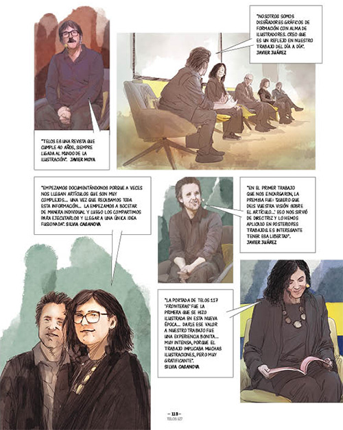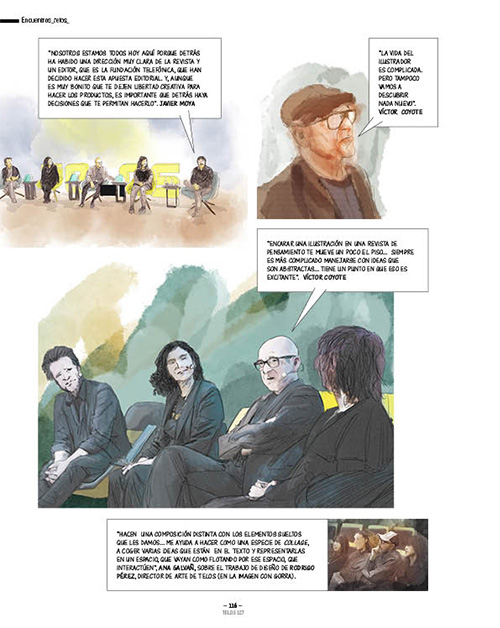 “La temática de la revista va mucho conmigo porque me interesa mucho ese tipo de pensamiento. Yo hago un trabajo que va bastante en la línea de lo tecnológico. Y, la verdad, a mí la ciencia me encanta”, comienza Ana Galvañ. Víctor Coyote apunta que “siempre es interesante dibujar para revistas que tienen textos con enjundia”. Silvia Casanova agradece “venir a Madrid… Salir a que nos dé el aire es algo nuevo”. Su compañero en la vida y el trabajo, Javier Juárez, la sigue: “Sobre todo por tener esa oportunidad de trabajar de forma regular, porque nos permite evolucionar junto con la propia revista, y vemos nuestra progresión en el mismo medio”.