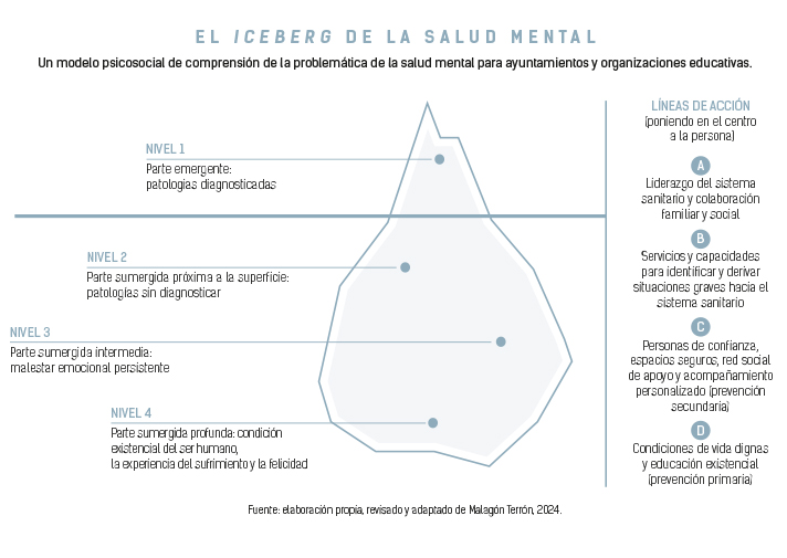 Este modelo representa la realidad de la salud mental en forma de iceberg. Mientras en su zona emergente encontramos una creciente acumulación de patologías mentales diagnosticadas (nivel 1), inmediatamente por debajo del nivel del agua se extiende una gran masa de hielo en la que se concentran las patologías aún no diagnosticadas (nivel 2).